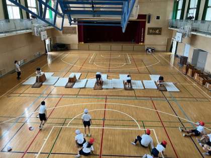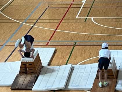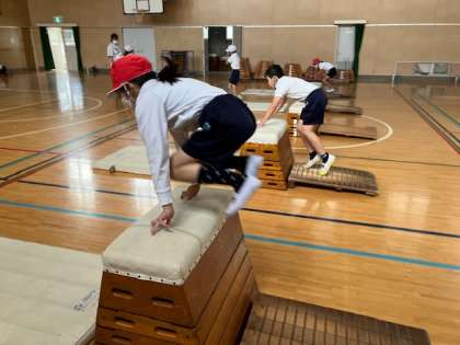 4年生の体育の授業、跳び箱に取り組んでいます。開脚跳びだけではなく、写真のように脚を閉じて跳び越したり、跳び箱の上で前転をしたり、いろんな技を練習しています。