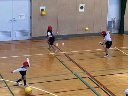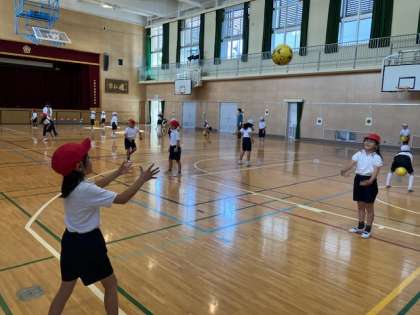 1年生の体育の授業です。ボール投げ・受けに取り組んでいます。