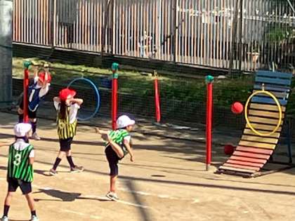 ペアで投げ合ったり、的(まと)をめがけて投げたりして練習します。
