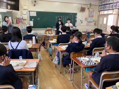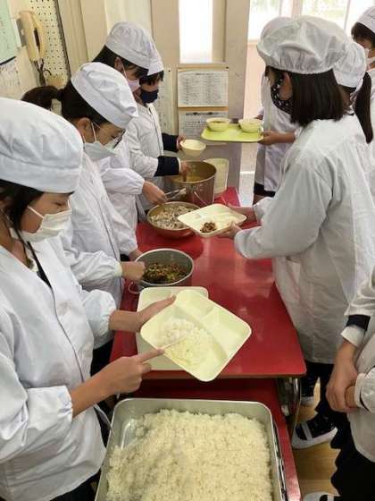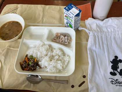 今日の給食献立は、ごはん・もずくと豚挽き肉のジューシー・さつまいものみそ汁・焼きれんこん・牛乳です。
