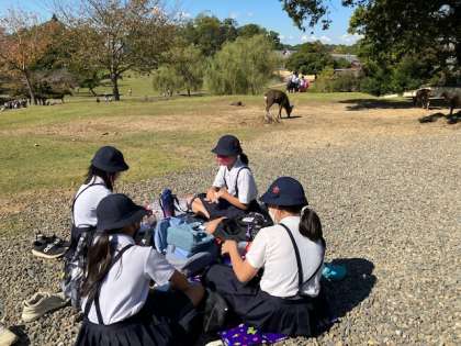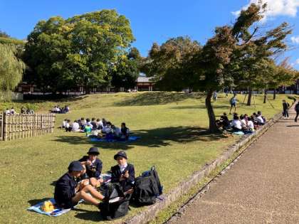東大寺の横の広場でお弁当タイムです。定番の景色のいいところです。鹿もいて、取られないように気をつけて食べます。