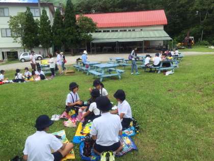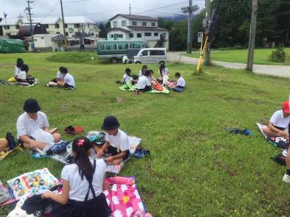 高原の爽やかな風の中でお弁当です。緑がきれいですね。
