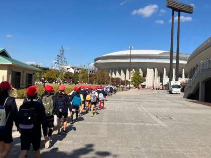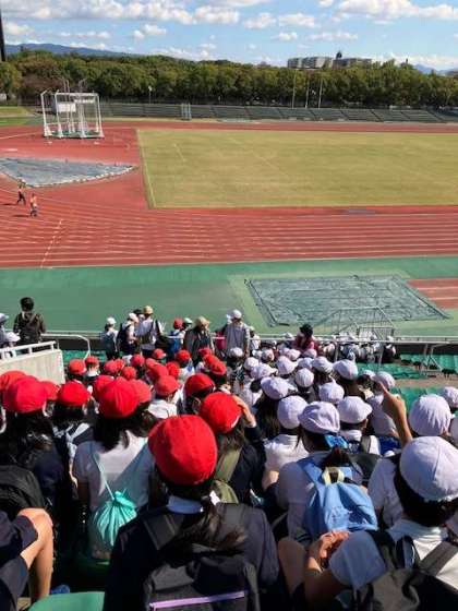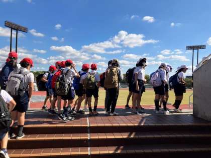 陸上競技場に到着しました。今から、フィールドで少し練習します。