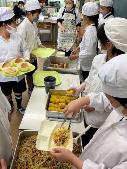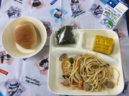 今日の給食献立は、黒糖パン(2分の1)・ウインナーときのこの和風スパゲティ・焼きとうもろこし・固形チーズ・牛乳です。