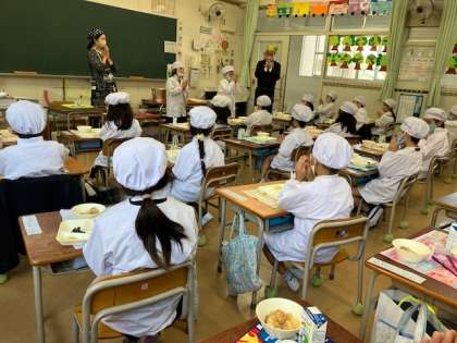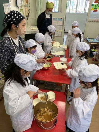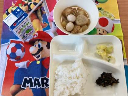 今日の給食献立は、ごはん・関東煮・白菜の甘酢和え・海苔の佃煮・牛乳です。