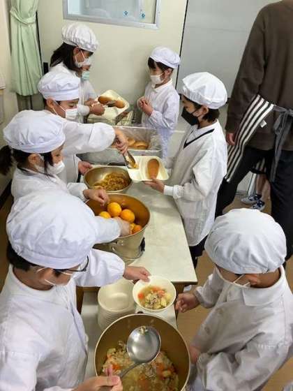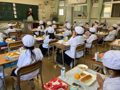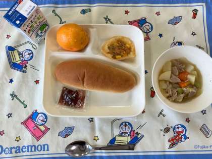 今日の給食献立は、コッペパン・豚肉と野菜のスープ煮・変わりピザ・いちごジャム・みかん・牛乳です。