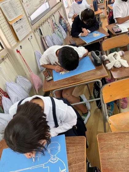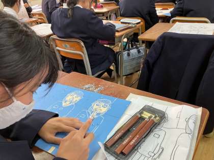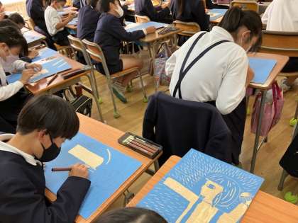 6年生の版画です。6年間の思い出のシーンを版画にしました。作品展に出品します。
