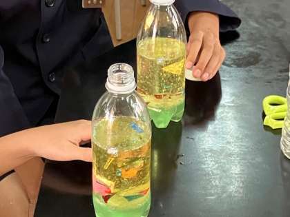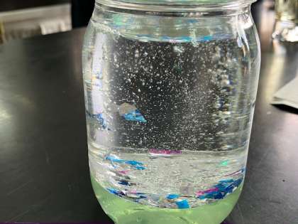 科学クラブでは、今回はキラキラオイルを作ります。オイルにきれいなキラキラを入れて発泡剤を入れると、あらら不思議、きれいなキラキラがオイルの中を泳ぎます!