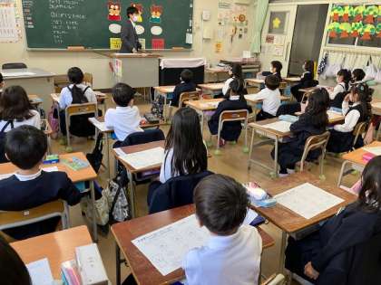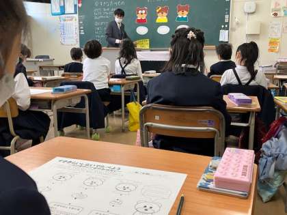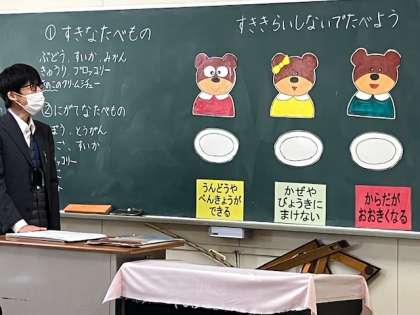 栄養教諭さんが、好き嫌いをなくして、偏りのない栄養を摂ることの大切さを、1年生にわかるように易しく丁寧に教えてくれました。