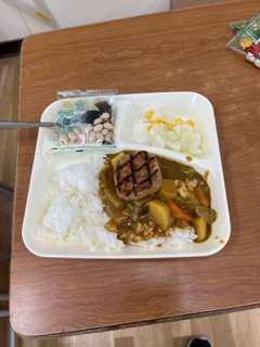 今日の給食は、牛乳、ハンバーグカレーライス、カリフラワーとコーンのピクルス、豆こんぶでした。人気のあるメニューなので、子どもたちは、とても喜んでました。