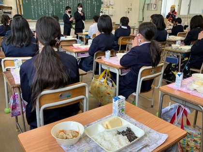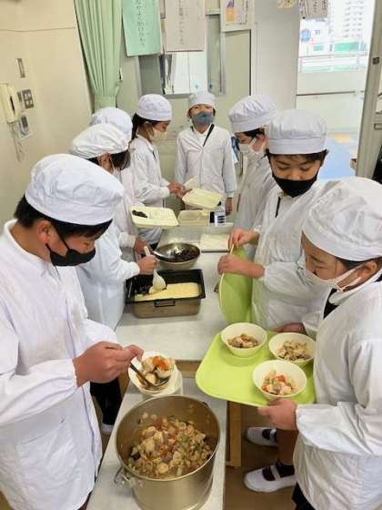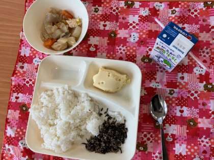 今日の給食献立は、ごはん・卵どうふ・一口がんもと野菜の煮物・魚ひじきそぼろ・牛乳です。