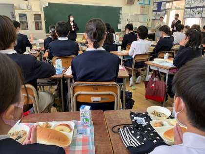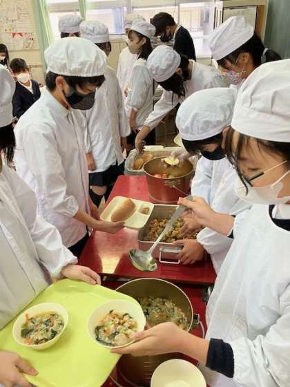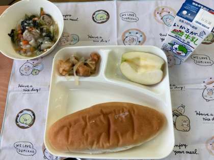 今日の給食献立は、コッペパン・鮭のマリネ・肉団子と麦のスープ・りんご・ブルーベリージャム・牛乳です。