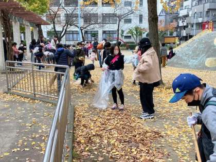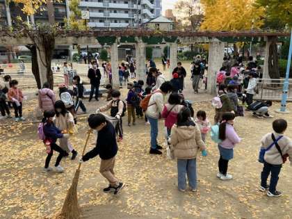 まず、向かいのパンダ公園で、芋を焼くための落ち葉拾いをみんなでします。