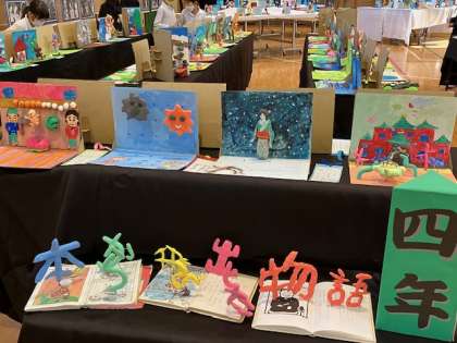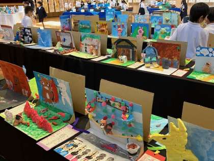 4年生の立体作品は、「本から出した物語」です。いろんな本の一場面を紙粘土とダンボールで立体的に制作しています。それぞれ浮き上がって見えるので、人形劇を観ている気分になります。