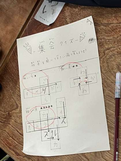 各班ごとで配られたクイズに回答します。文字数が多いほどすぐに答えが出て、二文字のは結構難しかったようです。集会委員さんたちが作っていた答え以外にも正解があったようで、中々の深みがありました。