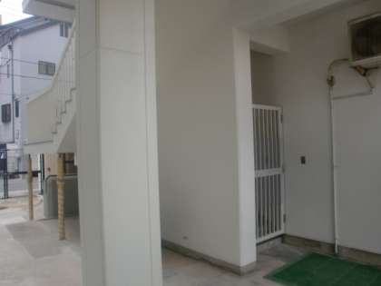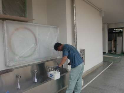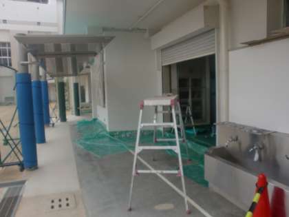 子どもたちがいない夏休みを利用して、管理作業員さんが校舎にペンキを塗っています。豊仁小学校がいつもきれいなのは、このような作業をしているからなのです。