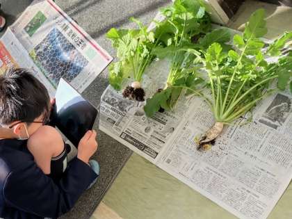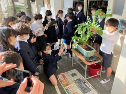 3年生の教室前で育ててきた野菜を収穫しました。