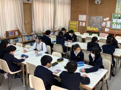 放送委員会では、給食の時に流す音楽でしょうか、たくさんの曲からみんなで選んでいます。
