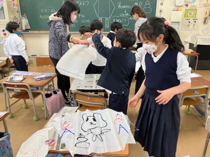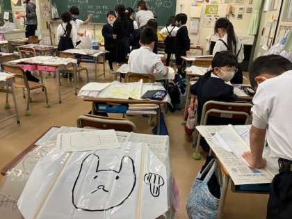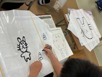 1年生は、来週木曜日に凧揚げをします。今日は、各クラスでその凧を作りました。凧に今年の干支のかわいいウサギを描きました〜。