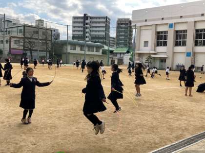 15分休憩の休み時間。ドッジボールと同じくらいの人数が、なわとびをしています。