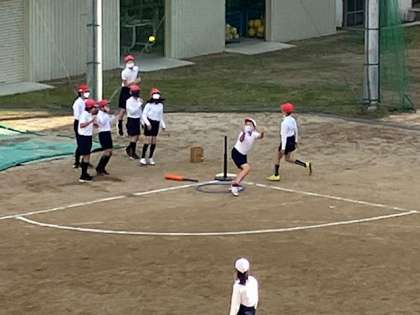 見ると、6年生の体育で、Tバッティングゲームをしていました。