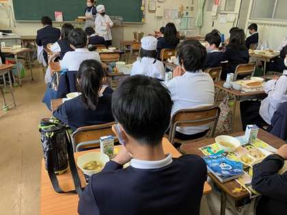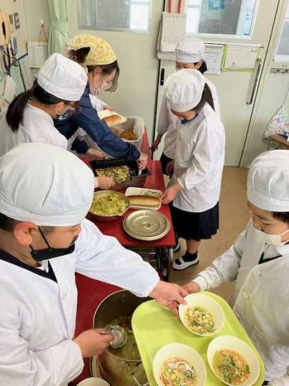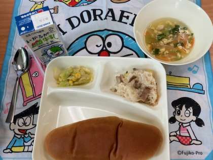 今日の給食献立は、黒糖パン・中華おこわ・キャベツのオイスターソース炒め・卵スープ・牛乳です。