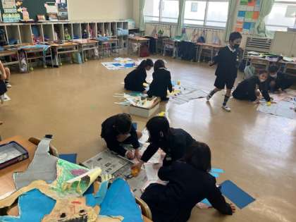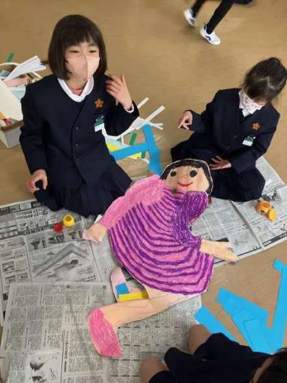 寝転んで、輪郭を友だちに取ってもらって、切り取って描きました。
