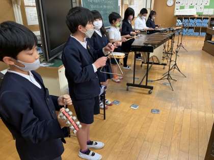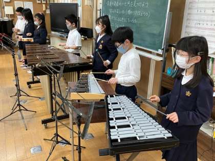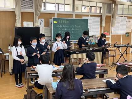 年度末、音楽の授業ではクラスごとに合奏の発表会をしています。練習の成果を発揮して、短い曲でも、しっかりとそれぞれの楽器を上手に演奏しています。