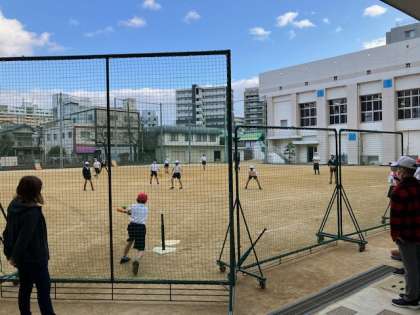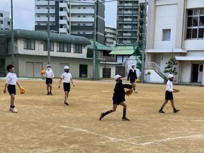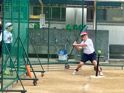 運動クラブでは、天気も良く運動場でT野球です。6年生は授業でも取り組んでいるので、打つのも捕るのもずいぶん上手です。
