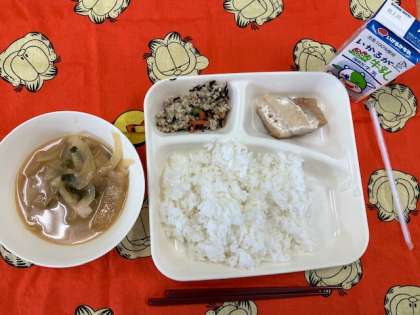 今日の給食献立は、ごはん・赤魚のレモン醤油かけ・高野豆腐のいり煮・味噌汁・牛乳です。