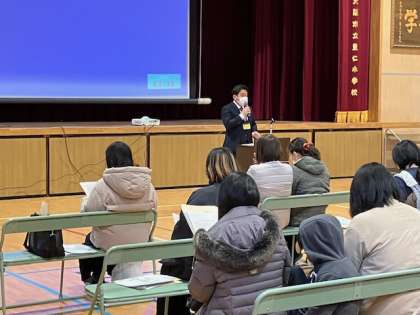 豊仁小学校の1年間の生活を簡単にまとめた動画を観ていただいた後、各担当から説明をしました。PTAからも会長さんから活動や会費の説明をしていただきました。