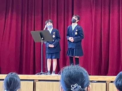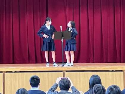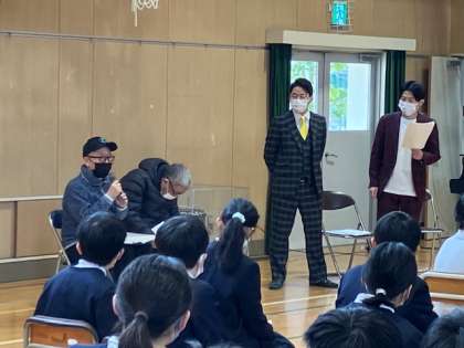 2時間めにプロの芸人さんからのアドバイスももらって練習し、3・4時間めに講堂の舞台で5年生全員がコンビで漫才を披露しました。