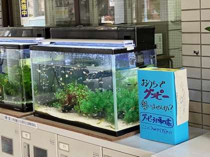 本日の配布プリントで詳しくお知らせいたします。ご希望の場合は「グッピー引き取り票」を切り取ってご記入いただき、来週以後に水槽横の箱(写真の青い箱)にお入れください。