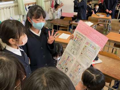 「調べたことを報告しよう」という単元で、班ごとに調べたことをそれぞれ報告し合っています。