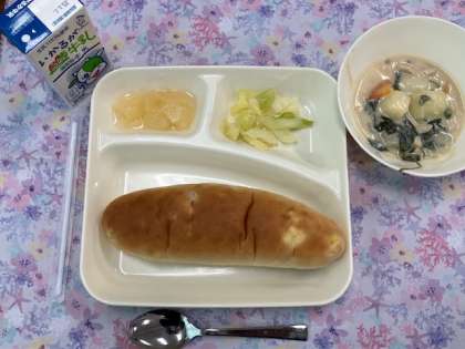 今日の給食献立は、おさつパン・ほうれん草のクリームシチュー・キャベツのサラダ・洋梨(缶詰め)・牛乳です。