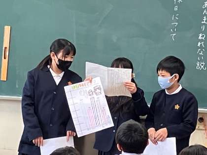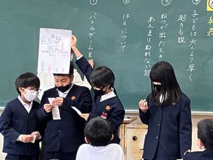 班ごとで独自のテーマを調べました。「子どもは大人より早く起きる説」「熱が出た時、あんまり眠れない説」「休日について」「バトルゲームをすると、暴言を言ってしまう説」
