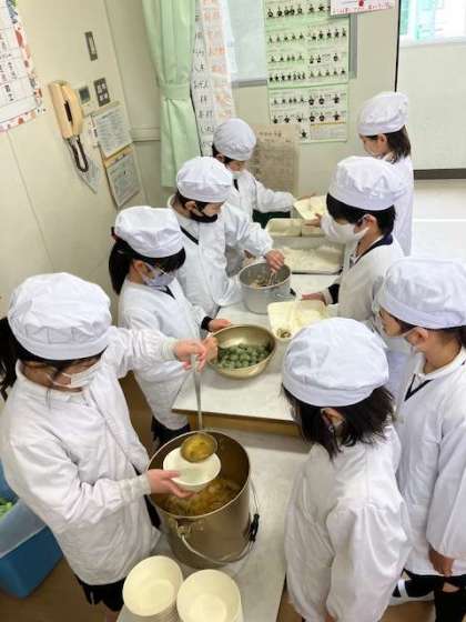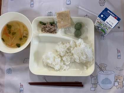 今日の給食献立は、ごはん・豚肉と野菜の炒め物・すまし汁・きな粉よもぎ団子・牛乳です。