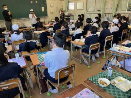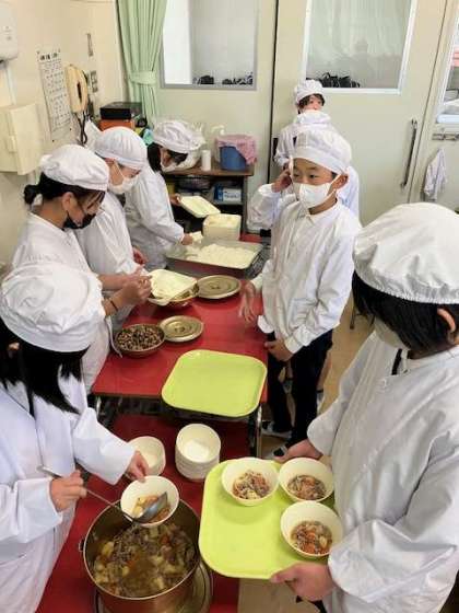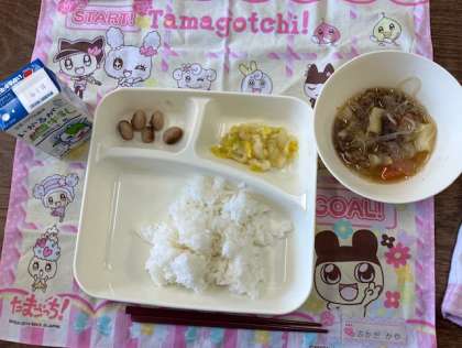 今日の給食献立は、ごはん・肉じゃが・白菜のゆず風味・とら豆の煮もの・牛乳です。