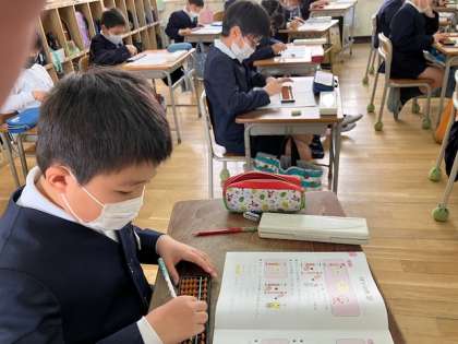 生まれて初めて「そろばん」を持つので、みんな、そろそろと玉を動かしていましたが、そのうちだんだんと慣れてきて、シャーと玉を上げる音も軽快になってきました。