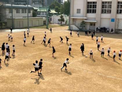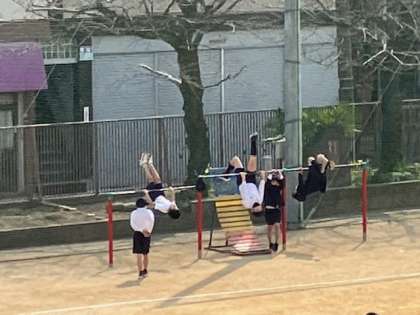 2時間めと3時間めの間は15分休憩です。少し長めの休み時間なので、たくさんの子どもたちが運動場で遊びに出てきました。オニゴ、ドッチボール、鉄棒、竹馬、長縄跳び、縄跳びなどなど、運動場のいたる所で遊んでいます。