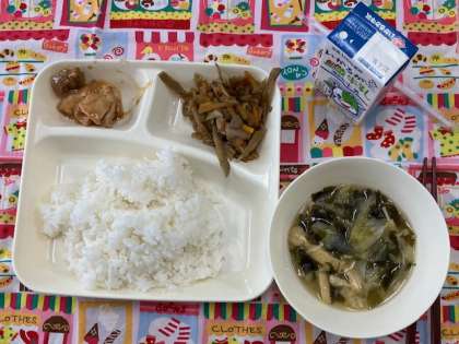 今日の給食献立は、ごはん・鶏肉の味噌バターソース・きんぴらごぼう・五目汁・牛乳です。