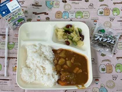 今日の給食献立は、チキンカレーライス(米粉)・ビーンズサラダ・ミニフィッシュ・牛乳です。
