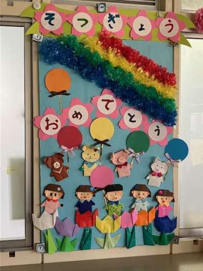 いきいき教室前の掲示板が、「そつぎょうおめでとう」バージョンに替わりました。