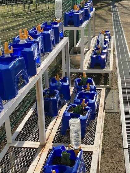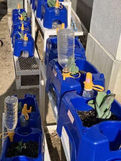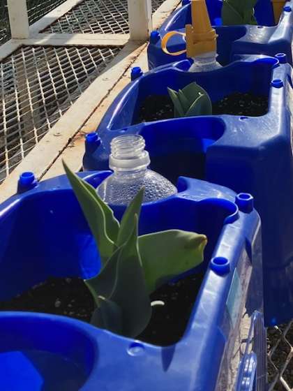 いい天気が続いて、1年生が育てているチューリップが急に大きくなってきました。
