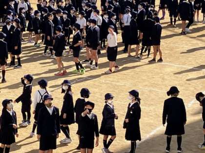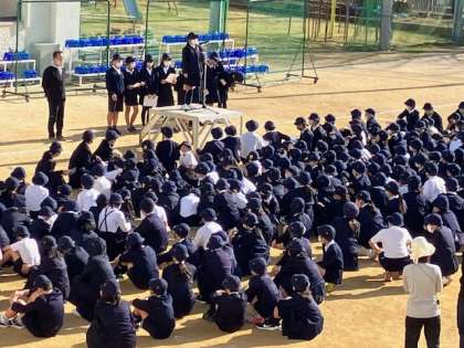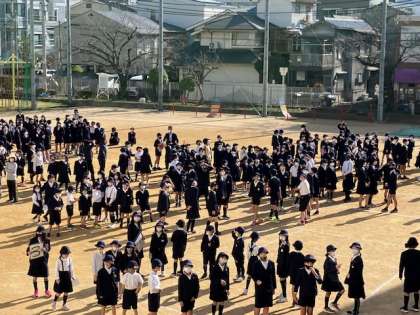 今日は木曜日、児童集会の日です。春の陽気の中、久しぶりに全校児童が運動場に揃いました。