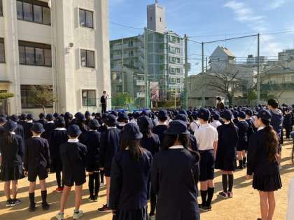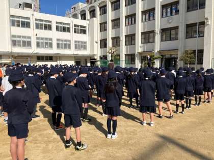今日は月曜日、児童朝会の日です。前回まで右端に並んでいた6年生がもういません。