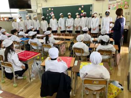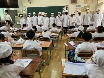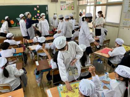 豊仁小学校では、新年度早々の1年生の給食準備と後片付けは6年生が担うことになっています。1年生はその様子を見て、今月末くらいから自分たちでするようにします。
