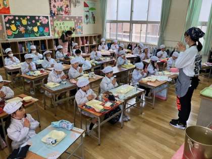 1年生では、食事タイムはたっぷりと時間をとります。ゆっくり食べて、食事の遅い子も嫌な気持ちにならないようにします。