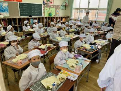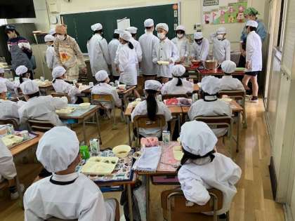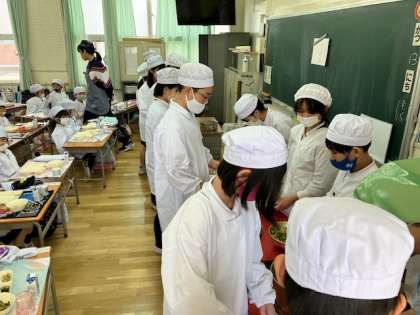 1年生の給食は、今は6年生が準備を担ってくれています。5年間の成果で、段取りよく上手に準備を進めてくれます。
