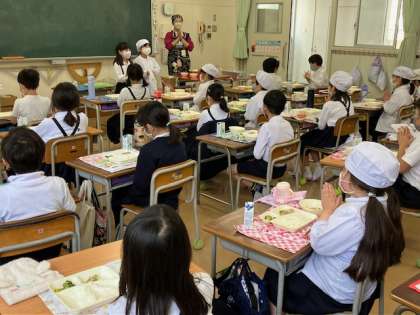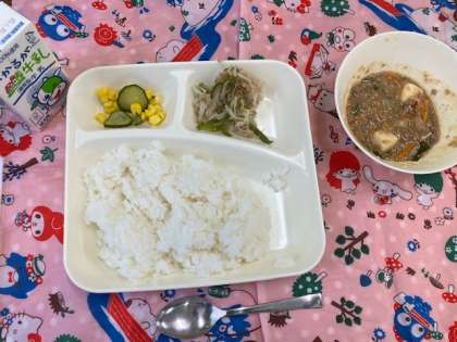 今日の給食献立は、ご飯・麻婆豆腐・きゅうりとコーンの甘酢和え・もやしとピーマンのごま炒め・牛乳です。